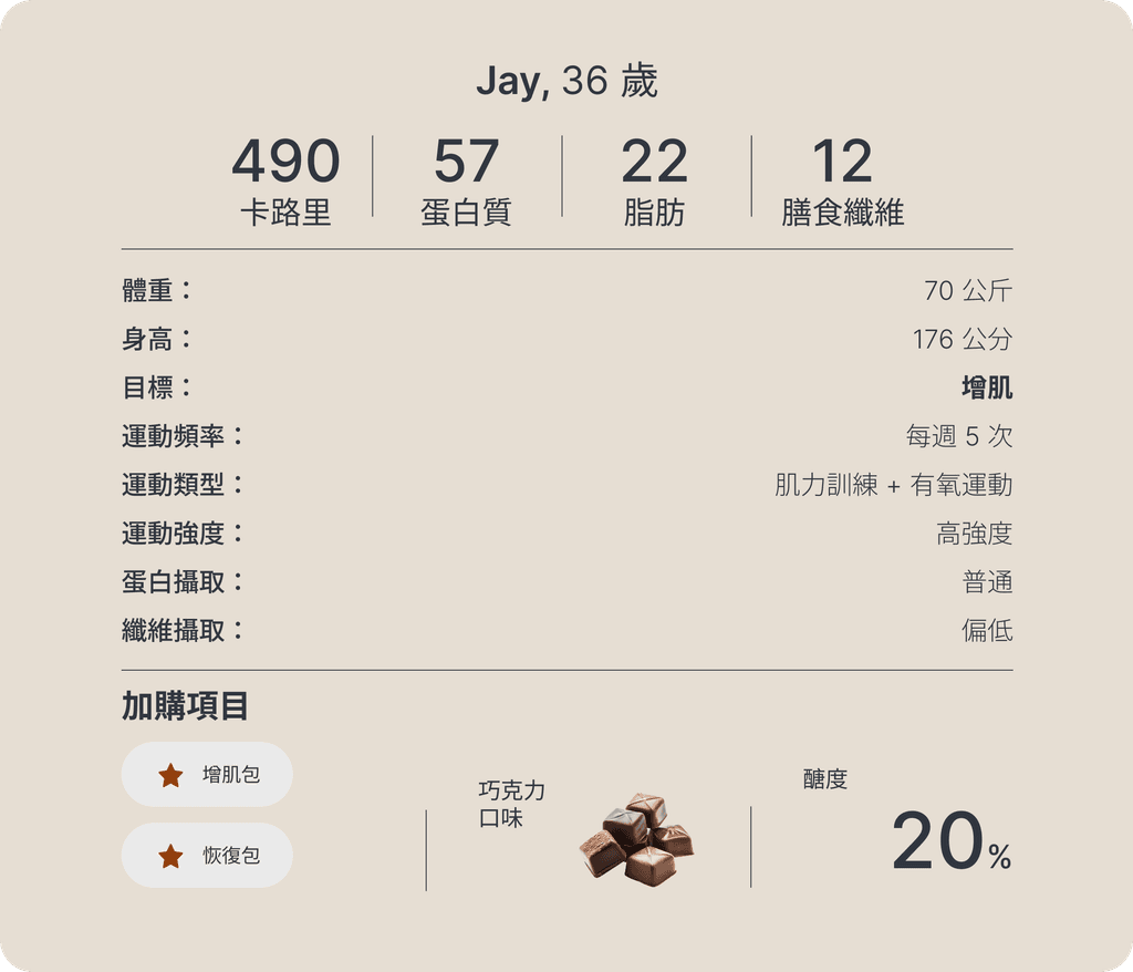 先完成一個簡短的生活與營養測驗, 只要一分鐘,我們就能為你打造更貼合目標的專屬配方。